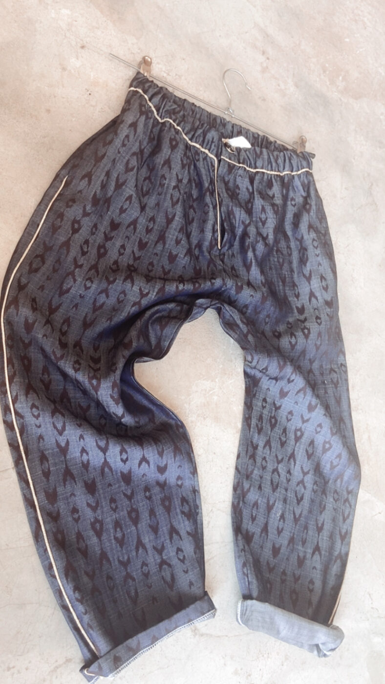 Amazigh Pant, Taille unique, Bouton et zip, Denim et motifs ethniques imprimés, Sfiffa (Fil ou bande le plus souvent doré, que l'on retrouve sur les tenues et vêtements traditionnels marocains).Détails