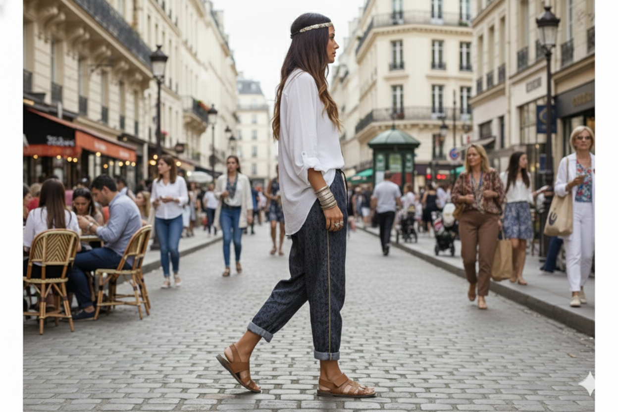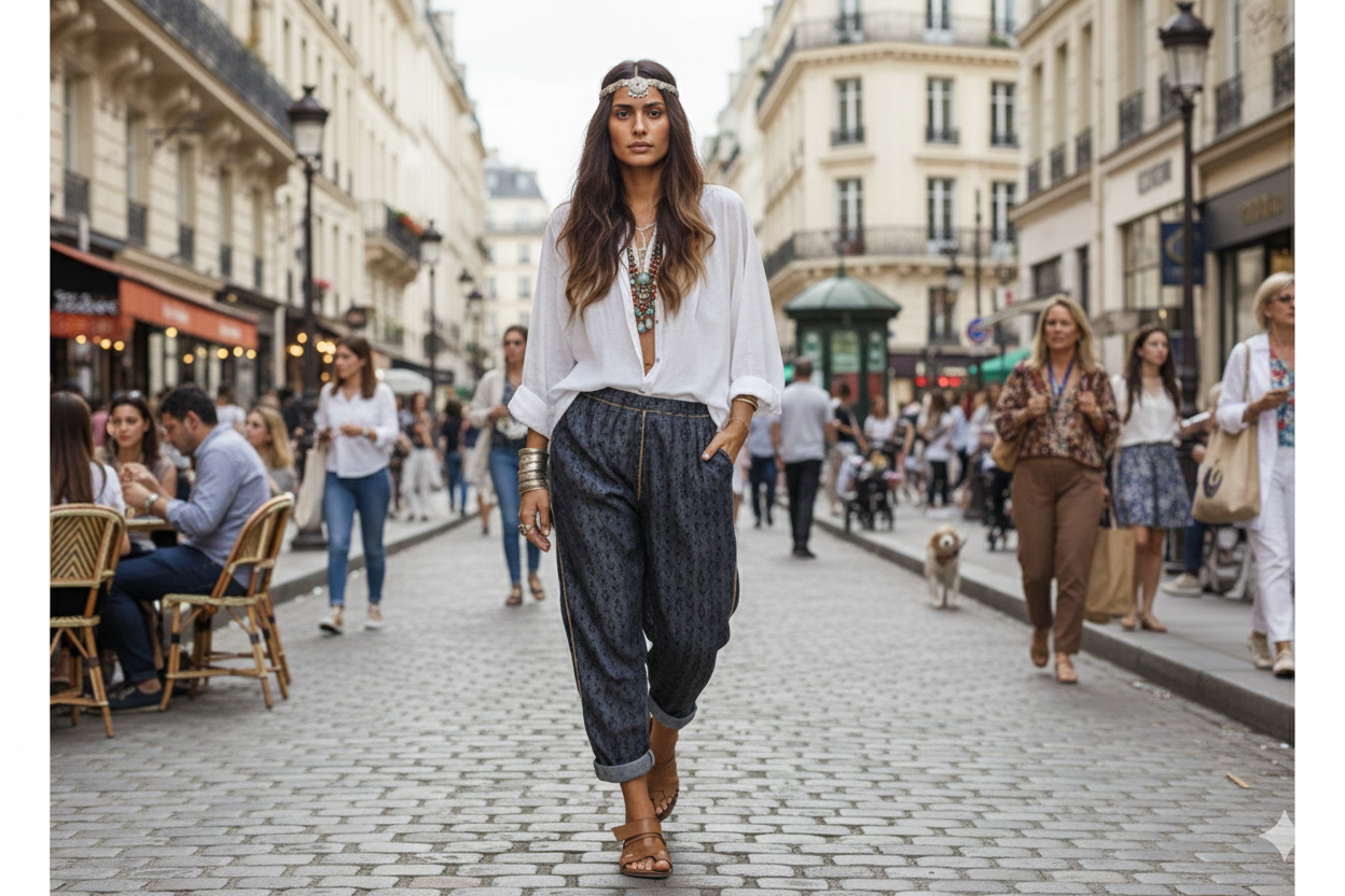 Amazigh Pant, Taille unique, Bouton et zip, Denim et motifs ethniques imprimés, Sfiffa (Fil ou bande le plus souvent doré, que l’on retrouve sur les tenues et vêtements traditionnels marocains).