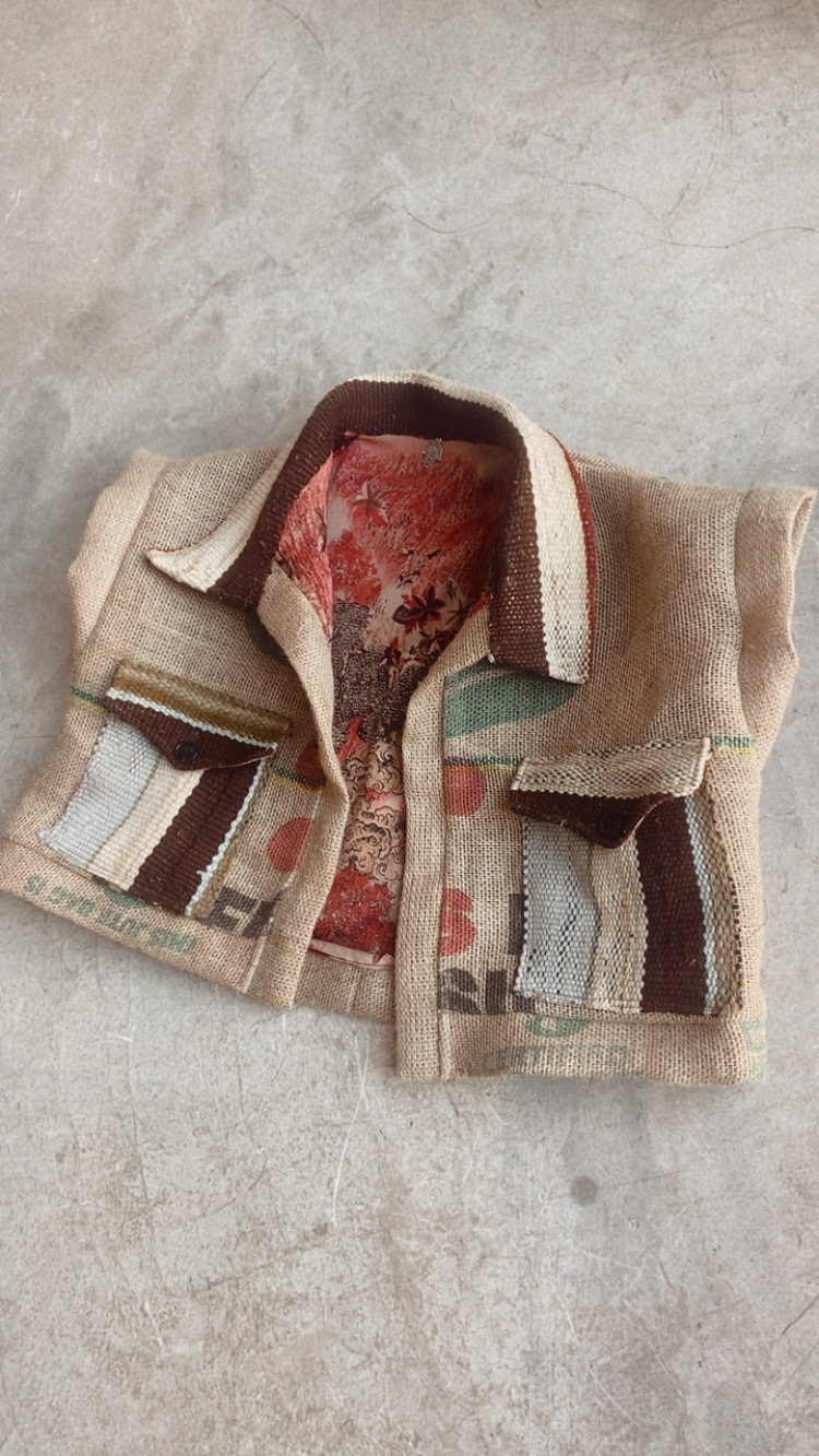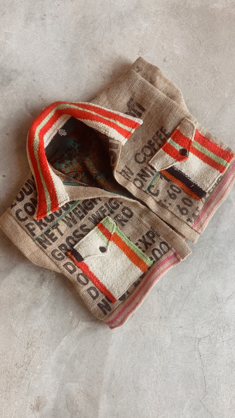 GILET COACHELLA, CREATION ARTISANALE DE LA MARQUE TIPI, 100% TOILE DE JUTE (SAC DE CAFE RECYCLE),PIECE UNIQUE,LES IMPRIMES D'ORIGINE ONT ETE CONSERVES, TAILLE UNIQUE, COUPE COURTE ET OVER-SIZE, POCHES ET COL, REVERS INTERIEUR EN SOIE.