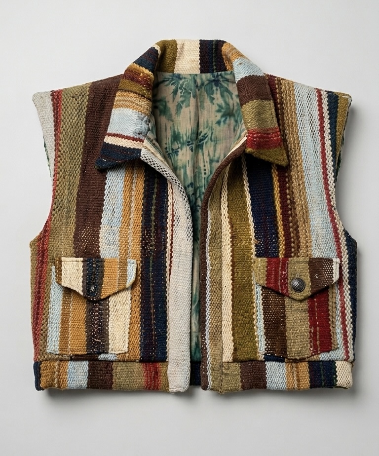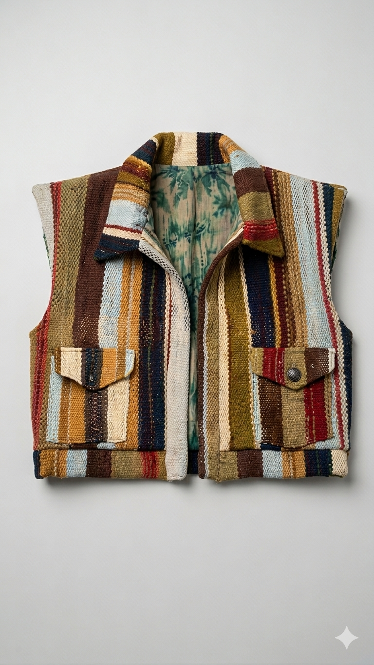 GILET COACHELLA, CREATION ARTISANALE DE LA MARQUE TIPI, 100% HAIK (TAPIS MAROCAIN),PIECE UNIQUE,LES IMPRIMES D'ORIGINE ONT ETE CONSERVES, TAILLE UNIQUE, COUPE COURTE ET OVER-SIZE, POCHES ET COL, REVERS INTERIEUR EN SOIE, TRES PEU DE QUANTITES.