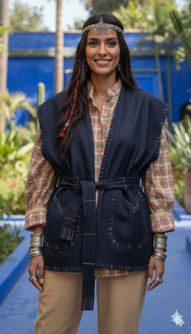 Gilet Mara,100% Denim, Broderies Hand-made, ceinture et poches.