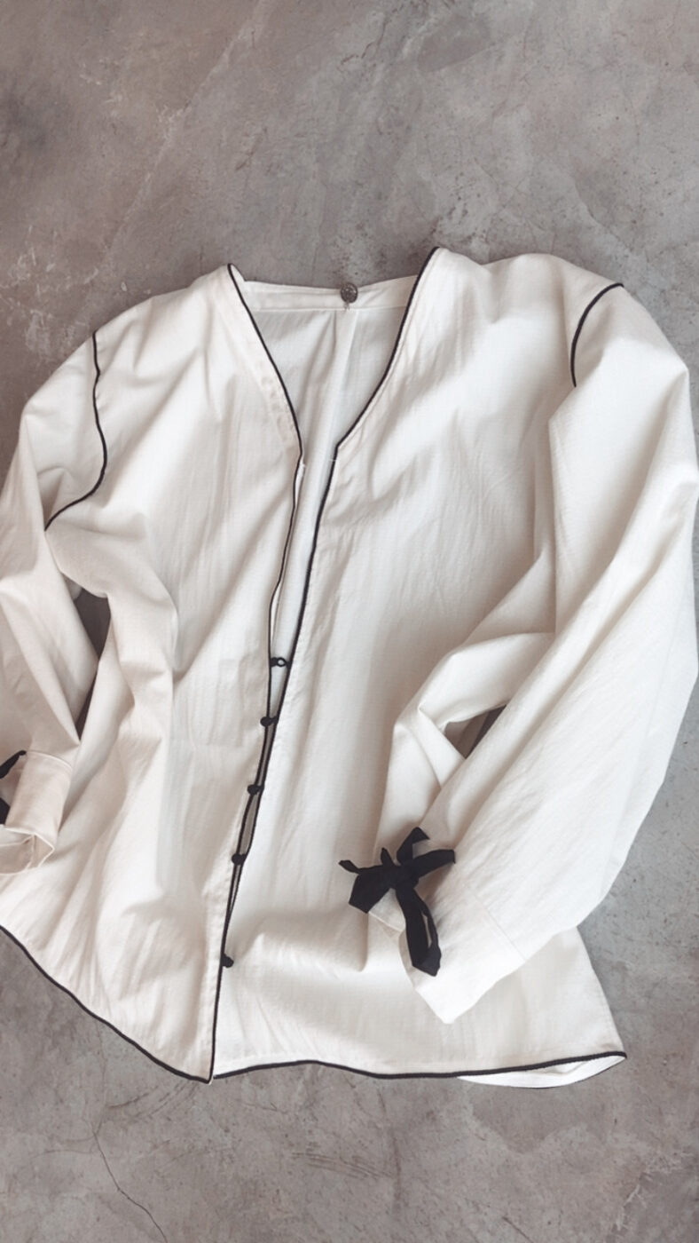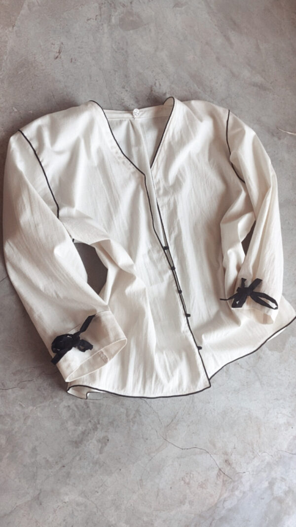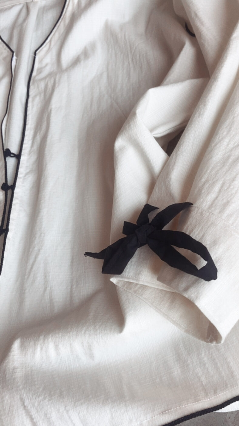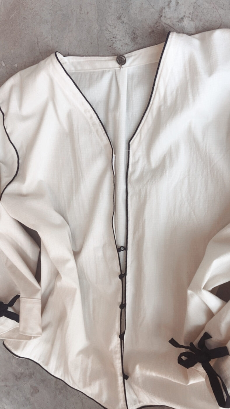Blouse Rima, Taille unique, Coupe over-size, modèle original, 100% Lin, boutons et broderies hand-made et noeuds sur les manches .