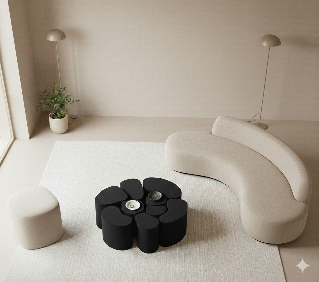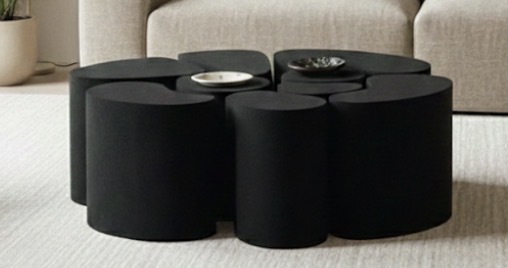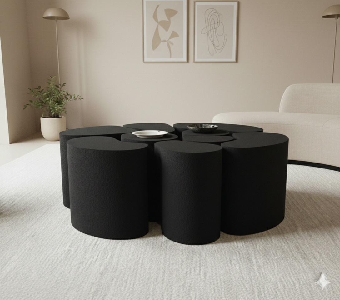 Belli Table, création originale de la marque TIPI, Table basse composée de 10 éléments aux différentes formes, effet WAW garanti, possibilité à l’infini de disposer vos éléments, axe de bois et projection de poudre de pierre pour donner un effet crépi, effet Mat, cette pièce originale se suffit à elle meme et sublimera n’importe quelle pièce.