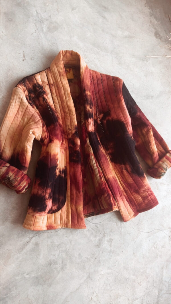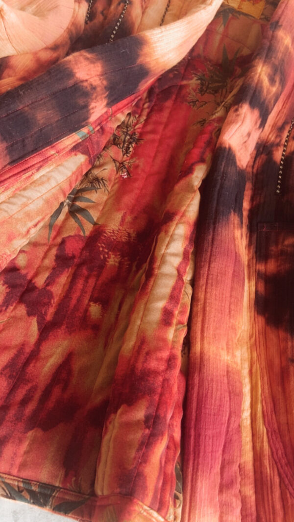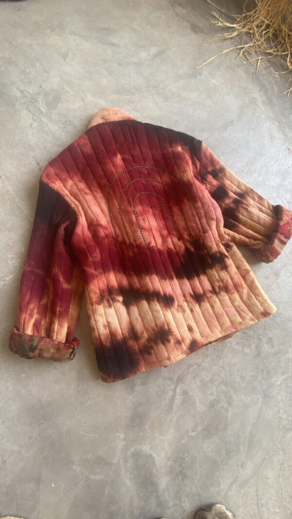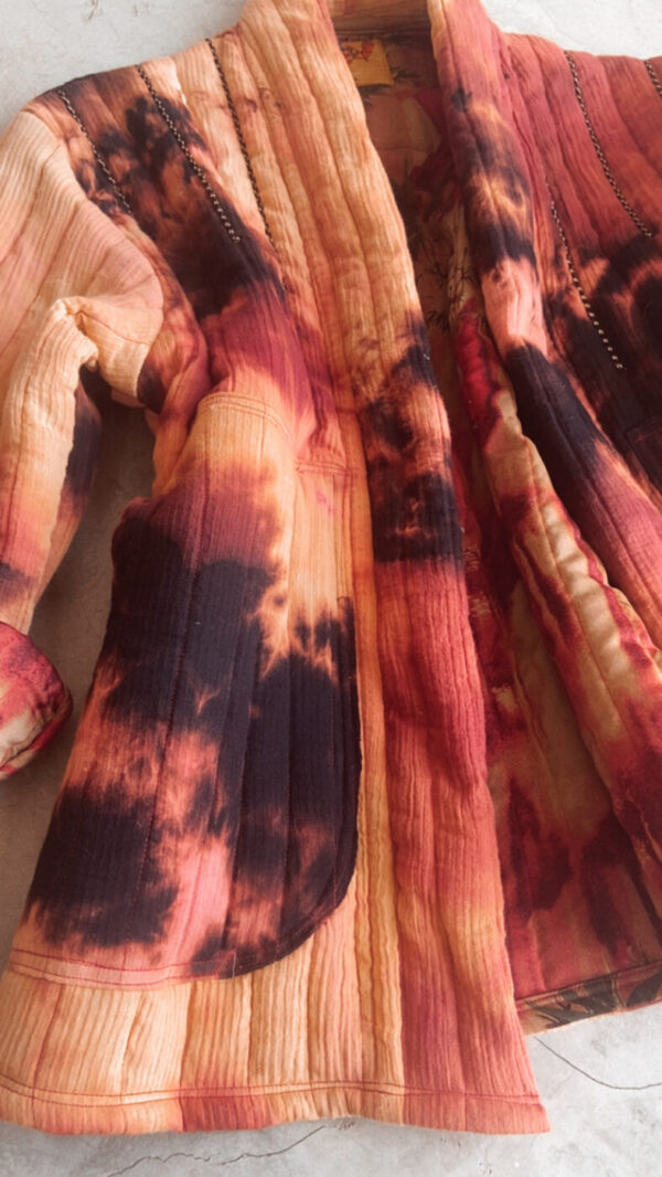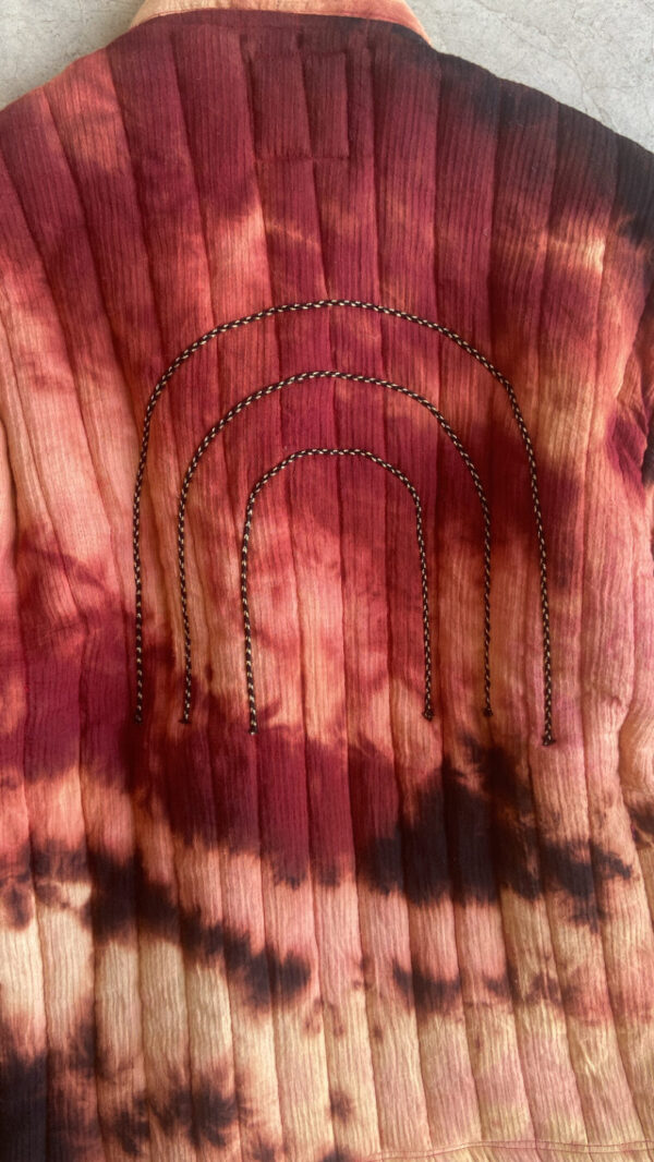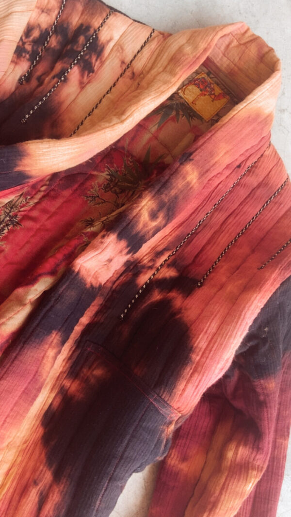 Kimono Beldi, Taille unique, Tie-die réalisé artisanalement, création unique de la marque Tipi, Sfiffa (Fil ou bande le plus souvent doré, que l’on retrouve sur les tenues et vêtements traditionnels marocains) revers intérieur 100% Soie et broderie arc-en-ciel au dos.
