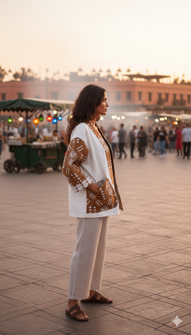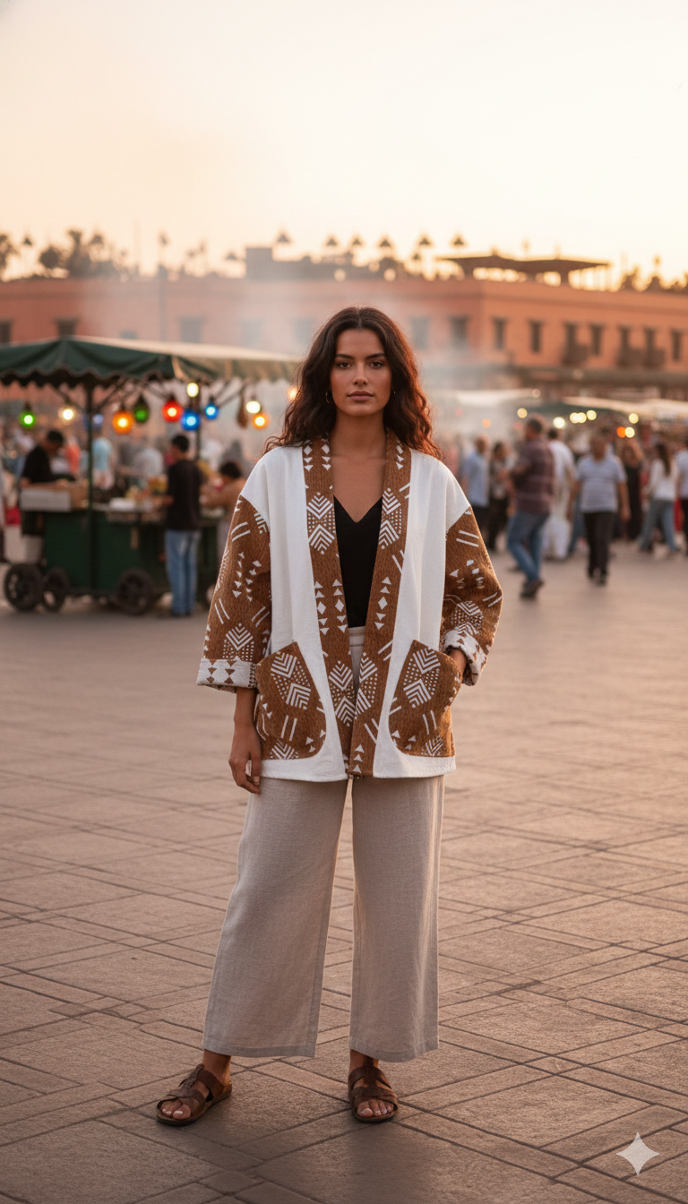 Kimono Edna, Taille unique, modèle unisexe, manches et col velours ethnique, 100% Coton Kiria, Coupe over-size.Détails
