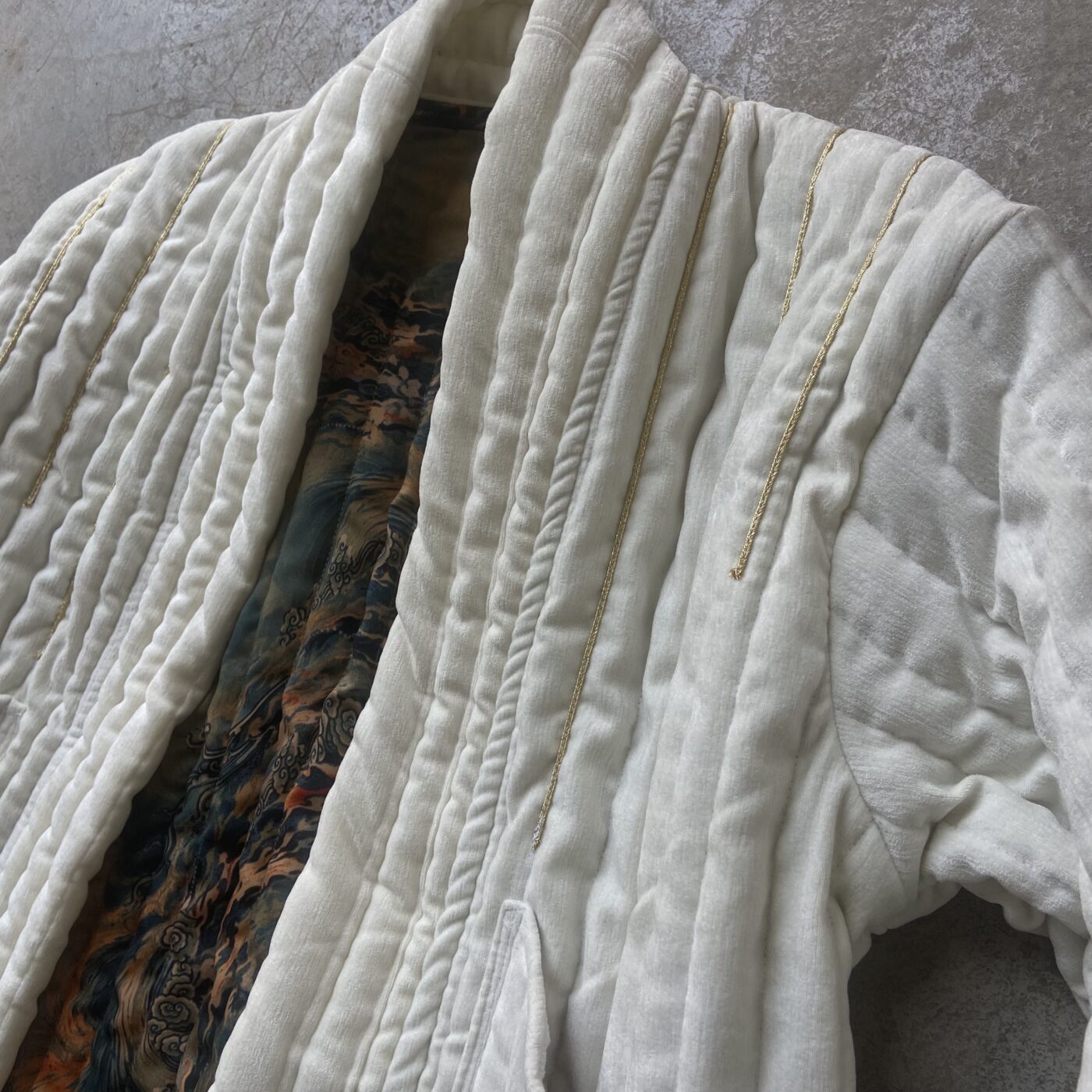 Kimono Lara, Taille over-size, velours et ornements fil doré, poches et revers intérieur 100% Soie, existe. en différents colorisDétails