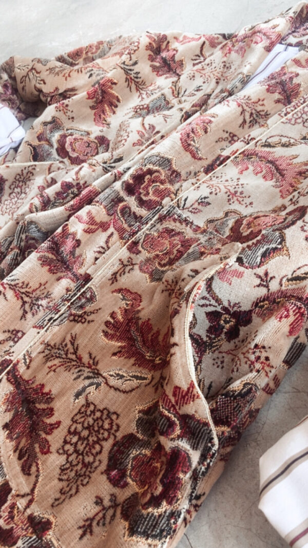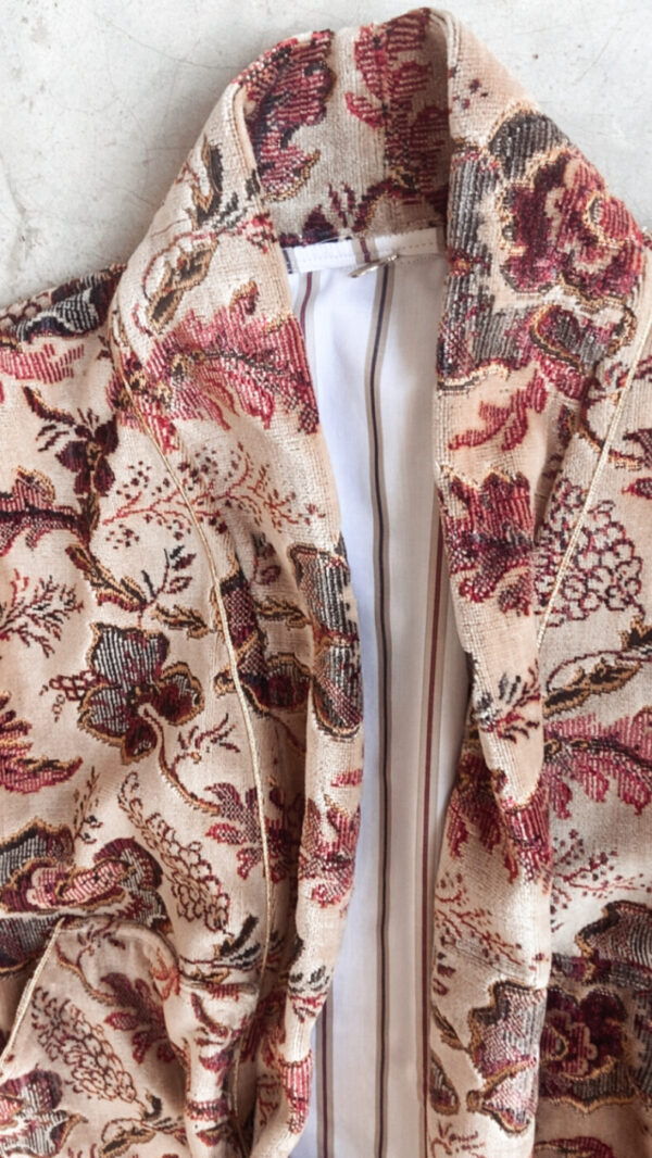 Velvet Jacket, Pièce unique, créée à partie de tissus ancien, 100% velours, les motifs sont incroyable. et la coupe kimono over-size contrastent parfaitement avec la matière, si vous cherchez une pièce unique et originale cette veste est faite pour vous.Détails